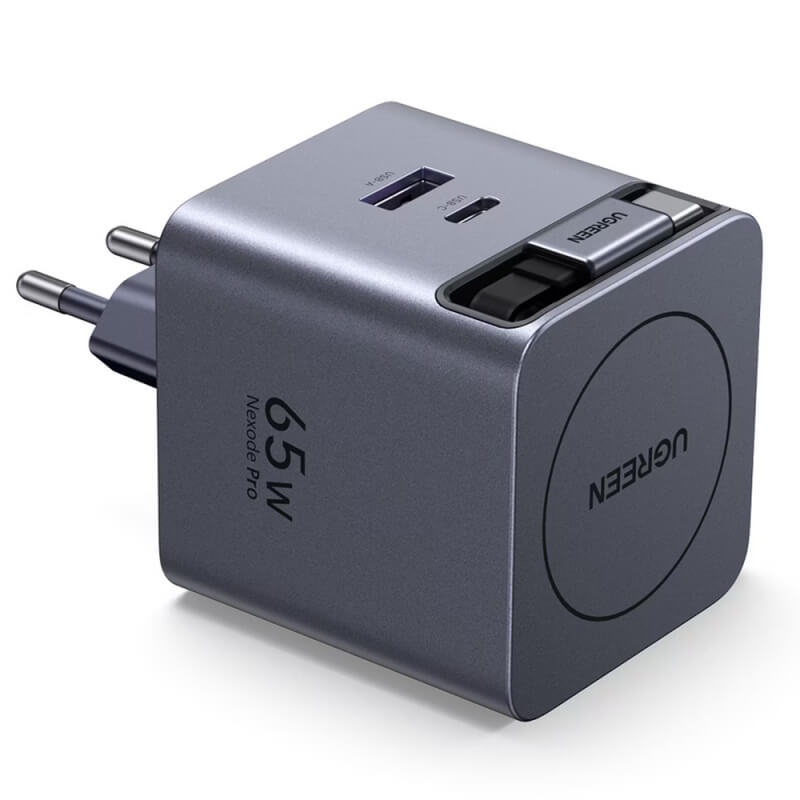 Захранване за ел. мрежа с вграден USB-C кабел и USB-A и USB-C изходи с технология за бързо зареждане - Ugreen X614 Nexode Pro Fast Wall Charger GaN 45W (тъмносив)