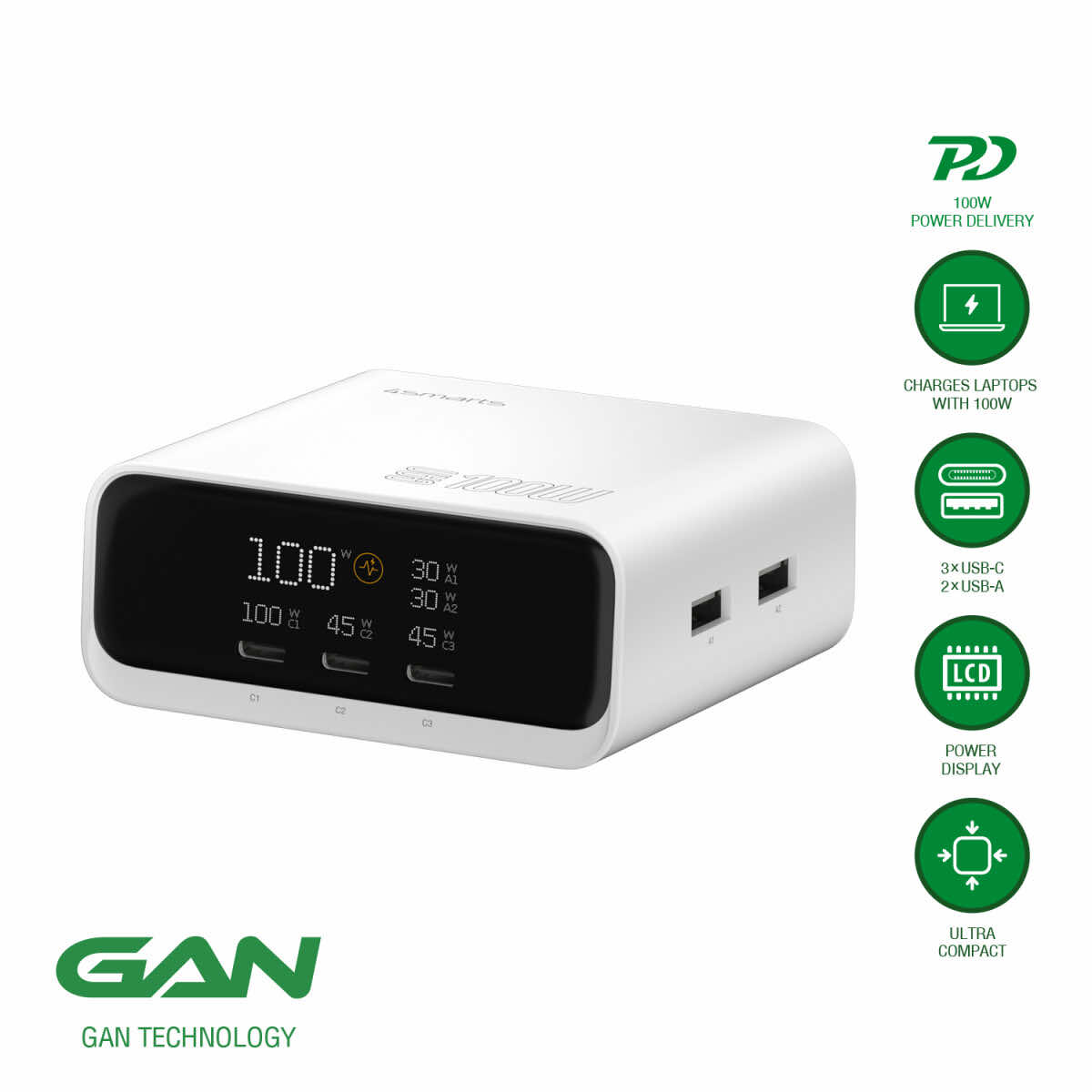 Захранване за ел. мрежа за лаптопи, смартфони и таблети с 2xUSB-A и 3xUSB-C изходи с технология за бързо зареждане - 4smarts Desk Charger GaN Screen 100W (бял)