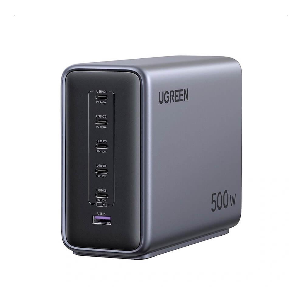 Захранване за ел. мрежа за лаптопи, смартфони и таблети с 5xUSB-C и 1xUSB-A изходи с технология за бързо зареждане - Ugreen Nexode GaN Desktop Fast Wall Charger 500W (тъмносив)