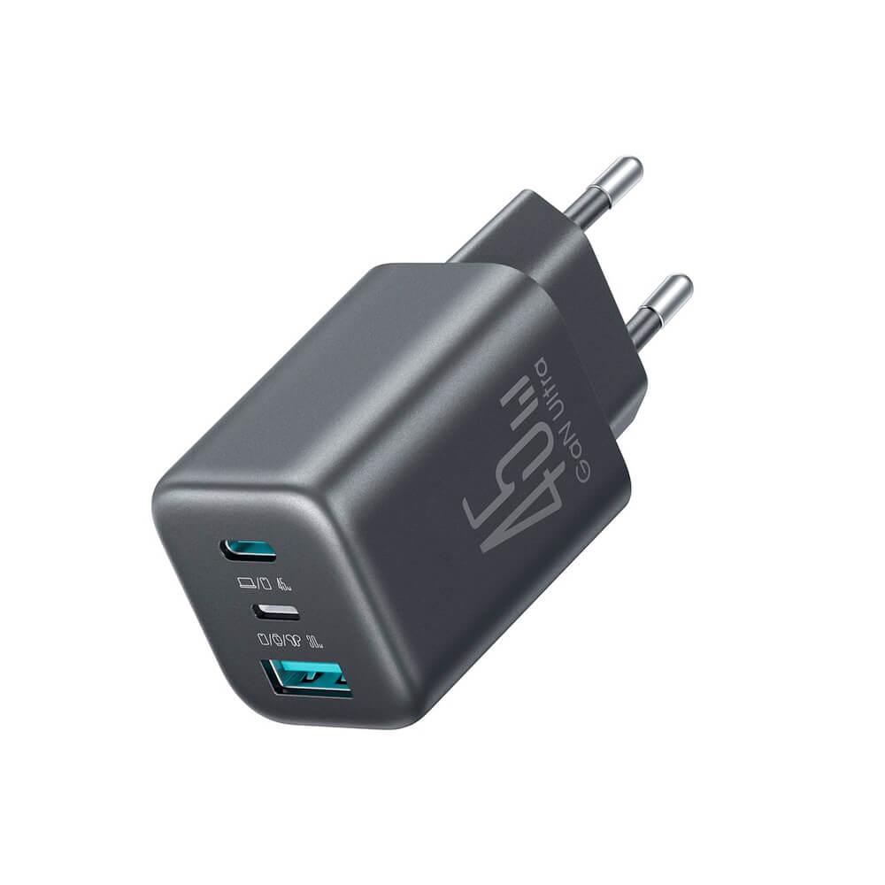 Захранване за ел. мрежа за мобилни устройства с USB-A, USB-C и Lightning изходи с технология за бързо зареждане - Joyroom JR-TO1 GaN 3-Port USB-C Lightning USB-A Wall Charger 45W (черен)