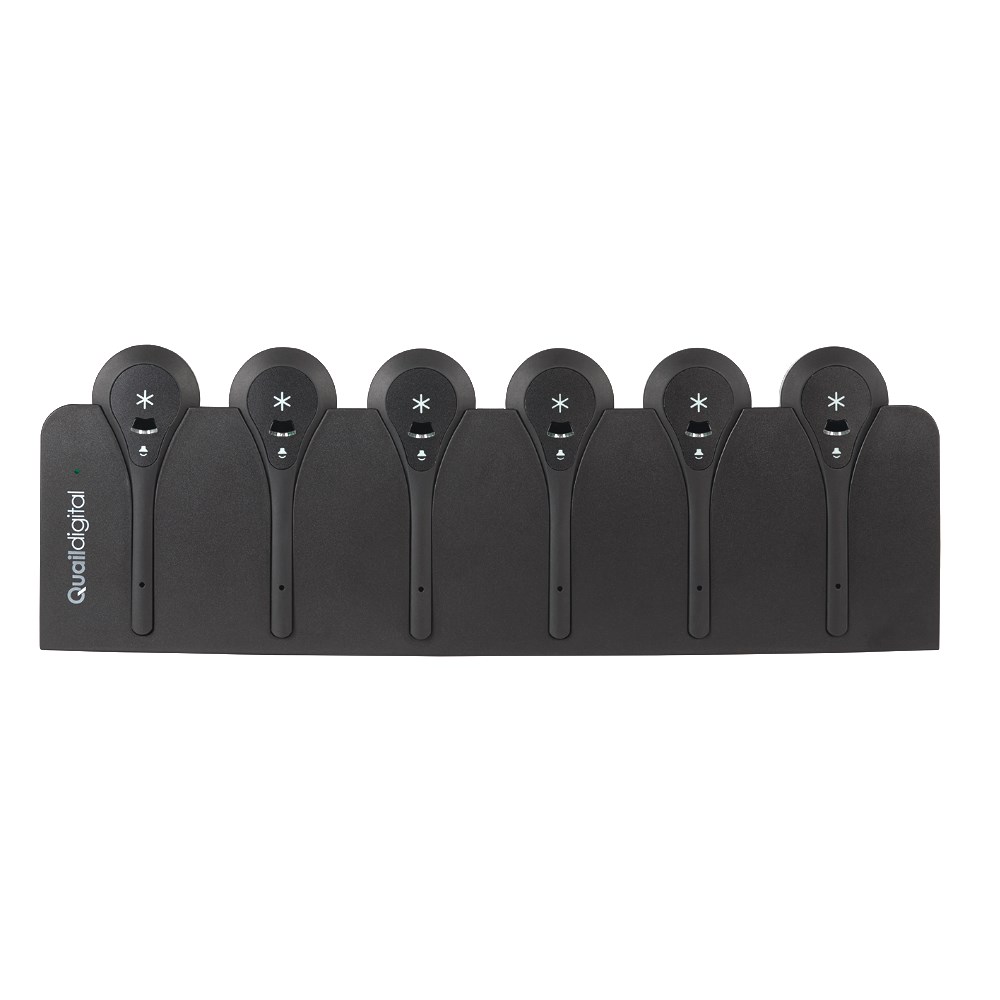 Quail Digital Pro10 Q-P10CH е професионална зарядна станция, предназначена за едновременно зареждане на до 6 слушалки от системата Pro10. Устройството е проектирано с удобни LED индикатори за състояние на зареждането и възможност за монтаж на стойка или друга повърхност. Идеална за болници, търговски обекти, ресторанти и други среди с интензивна комуникация.