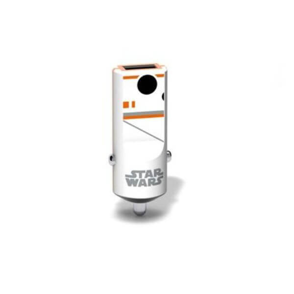 Зарядните устройства за кола на Tribe имат малък размер и голяма индивидуалност. Този модел с гланцово покритие е вдъхновен от BB-8, малкия дроид, който дебютира в епизод VII от сагата и сега е идол на многобройните фенове