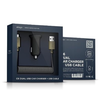 В комплекта: - 1 х Elago C6 Dual USB Car Charger - 1 x разтягащ се microUSB кабел
