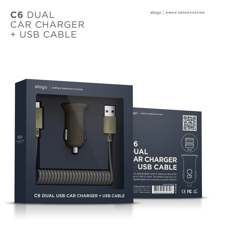 В комплекта: - 1 х Elago C6 Dual USB Car Charger - 1 x разтягащ се microUSB кабел