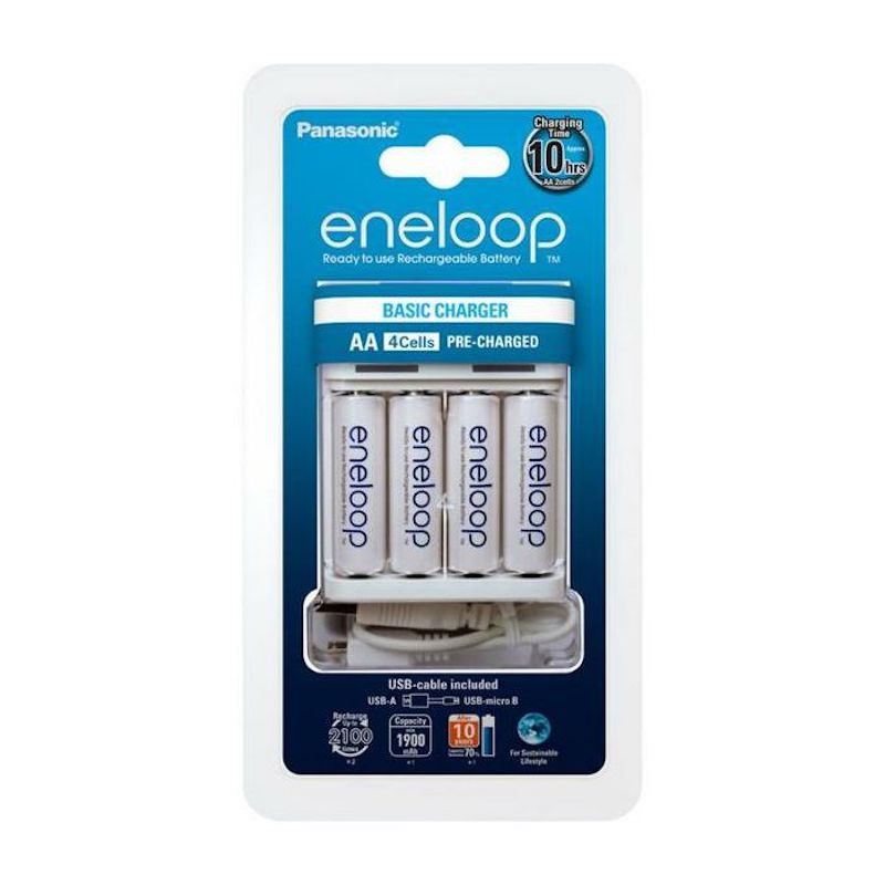 В комплекта: - 1 x Panasonic Eneloop Basic Charger - 1 x USB-A към microUSB кабел - 4 x AA батерии 1900 mAh