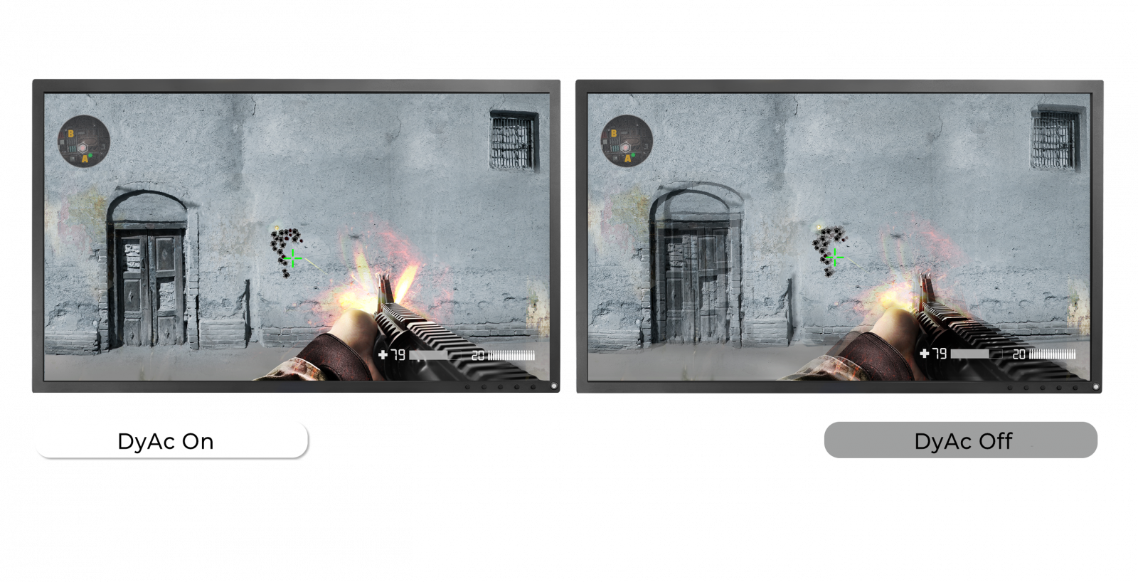 DyAc™ makes vigorous in-game actions such as spraying less blur. This allows gamers to see the position of crosshair and impact points more clearly which can help with recoil control. DyAc+ is based on this same technology and through panel optimization, provides gamers with a different option for actions such as spray control.
