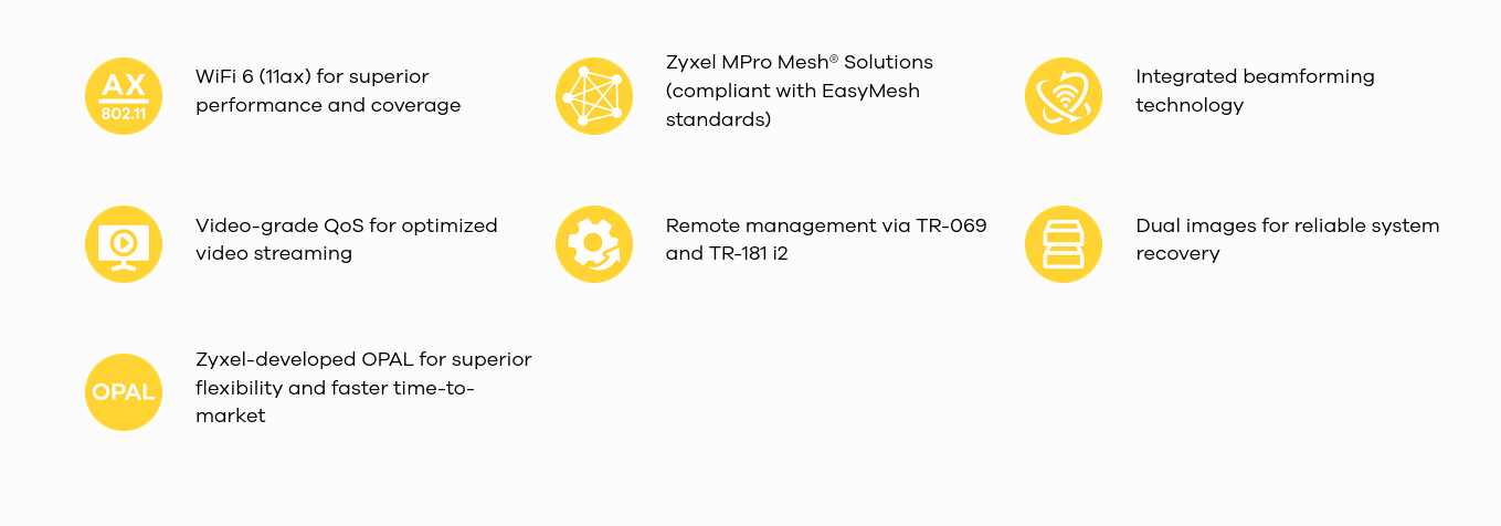 Supporting TR-069 for simplified remote configuration, firmware upgrades, diagnosis and TR-181 issue-2 for enhanced visibility on the LAN network, the Zyxel WX3100-T0 enables superior customer service with the lowest possible OPEX.